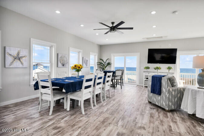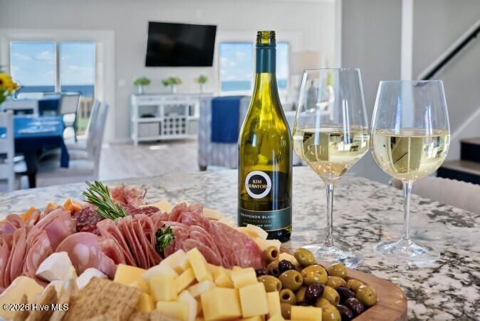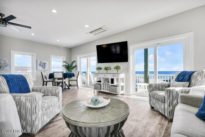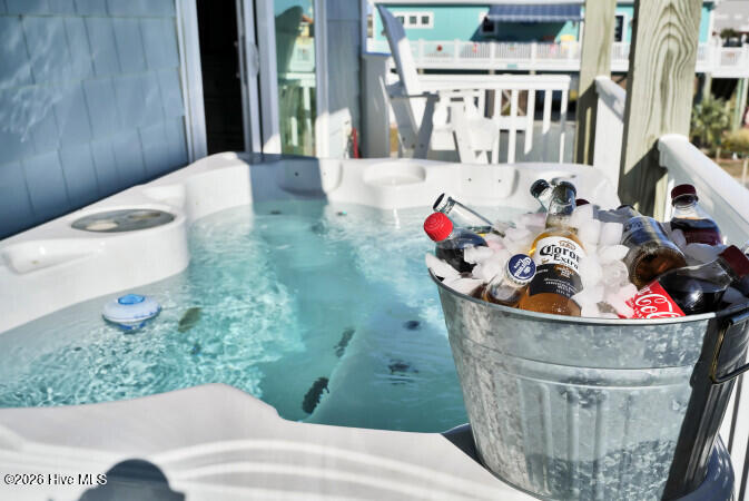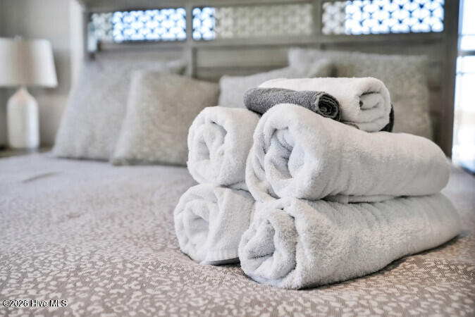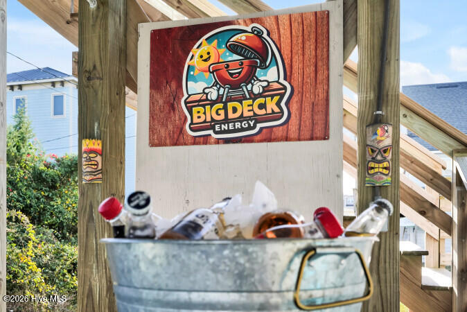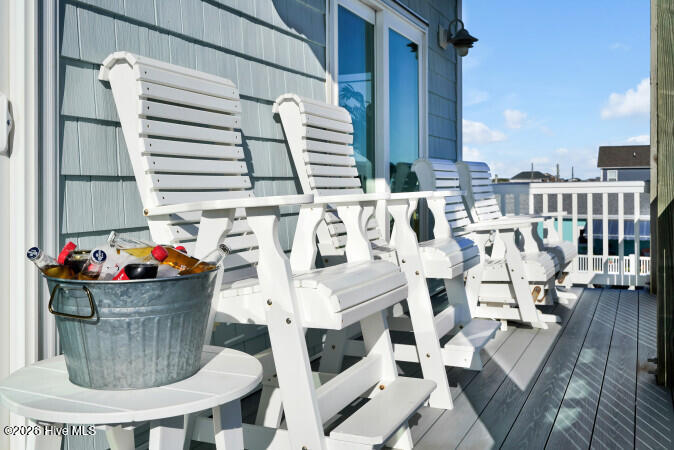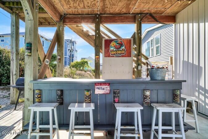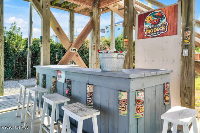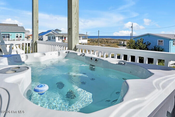 Custom built 6 bedroom 5 bath home with amazing ocean and sound views from multiple decks ocean and sound side on each floor. Located in federal flood insurance eligible area of North Topsail Beach. All the bells and whistles for a perfect beach house with a ground level 'tiki bar', for those afternoon cool drinks after spending your day on the beach with an outside shower for washing off the salt water of the Atlantic Ocean. A hot tub on first living level oceanside deck for relaxing and recuperation. First living level has 4 bedrooms and two baths for all your guests comfort, Second floor has main living area with spacious sitting area with open ocean views, a dining area adjacent to a gourmet kitchen featuring lots of granite countertop space, a large island with seating, top of the line stainless appliances, a full bath, and laundry room with two washers and two dryers to accommodate guests finish out this floor. On the top floor there's two (2) large master suites with ensuite baths and private decks for forever views. This property is an excellent weekly rental investment currently and would be a lovely second home for your extended family. Fully furnished with all accessories and items necessary to make this purchase a turn key opportunity for the discerning buyer and it is ready to produce income for 2026
